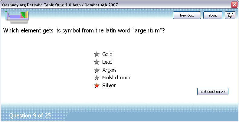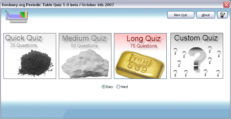 Periodic Table Quiz obsahuje až 801 otázek vytvořených pro testování znalostí periodické tabulky, prvků a jejich vlastností, stejně jako chemie a chemických procesů. Zahrnuje také obrázkové otázky.