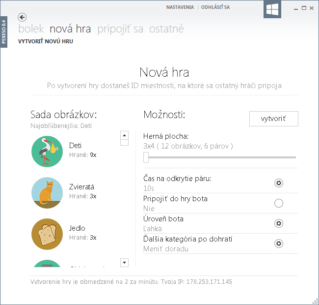 Pexeso Multiplayer je online varianta obľúbenej hry. Ja je pre dvoch až štyroch hráčov a na výber je viac ako 1500 obrázkov v 50 kategóriách. Hru je možné prispôsobiť zmenou kategórie, veľkosti hernej plochy, max. časom na odkrytie páru. Do hry je tiež možné pripojiť PC a hrať s ním. Behom hry môžeš získať rôzne bonusy, za ktoré dostaneš body. Hra obsahuje rebríček hráčov takže si môžeš s ostatnými porovnať svoje skóre. V hre je tiež online chat kde si môžeš s hráčmi dopisovať. Registrácia do hry je bezplatná a zaberie ti menej ako minútu