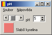Posuvníkem nebo zadáním číselné hodnoty pH se zobrazí barva indikátorového papírku. Zároveň se vypíše i slovní popis látky.