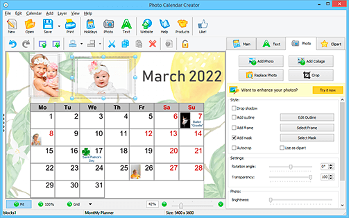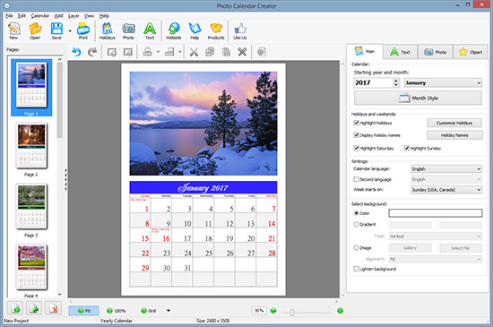 Photo Calendar Creator je aplikace vhodná pro vytváření krásných fotografických kalendářů pro každý rok nebo měsíc. Díky tomuto programu lze vytvářet stylové profesionálně vypadající kalendáře s vlastními fotografiemi. Množství možností dekorace a obrovských obrázkových galerií pomůže vytvořit stovky vlastních kalendářů v různých stylech a vytisknout je.