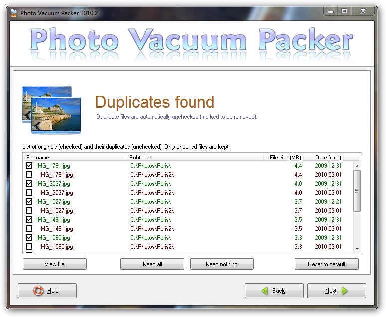 Photo Vacuum Packer vytváří optimalizované kopie vašich fotografií. Optimalizované fotografie můžou zabírat až o 50% méně volného místa na disku než originály a to i v případě, že rozměry jsou stejné. Původní fotografie zůstanou neporušené, protože optimalizované snímky jsou vždy zapsány do samostatné složky.