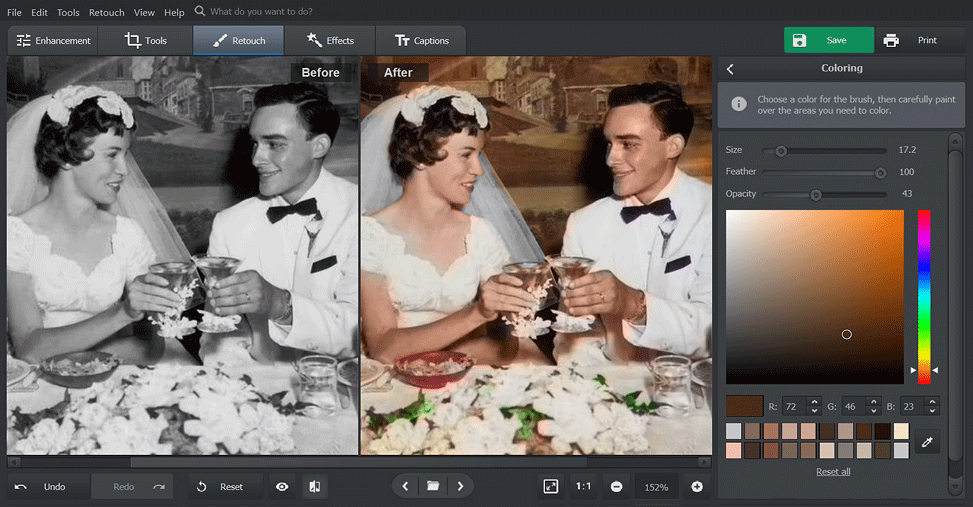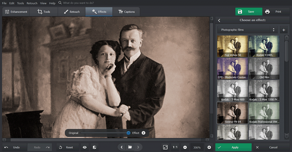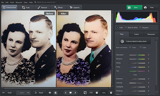 Pomocí programu PhotoGlory můžete barevně upravovat černobílé snímky v plně automatickém režimu, beze zbytku odstraňovat škrábance, trhliny, skvrny a fleky, opravovat poškozené části a dokonce sešívat dvě poloviny k sobě. Chcete-li svým uloženým fotografiím dodat retro nádech, použijte jedním kliknutím některý z více než 100 uměleckých efektů.
