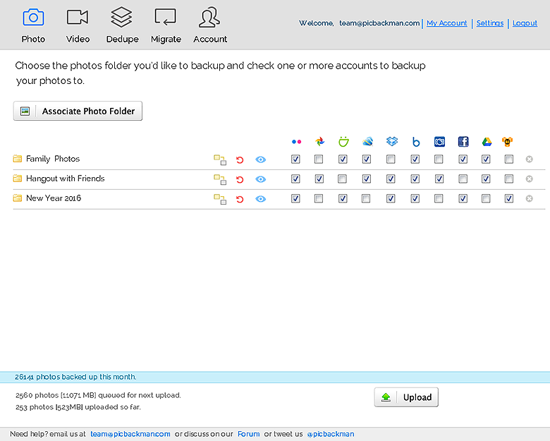 PicBackMan zálohuje digitální fotografie a videa do cloudu. Umí vyhledávat také duplicitní soubory na serverech Flickr, Google Photos, Smugmug, OneDrive, Dropbox, Photobucket, Google Drive, Facebook, Box, Instagram, YouTube, Foursquare nebo na vašem Amazon serveru.