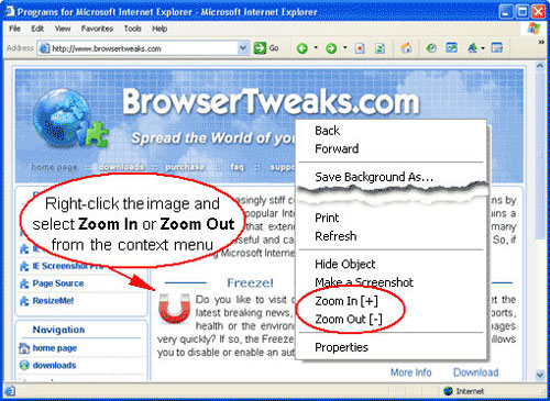 S programem Picture Magnifier si můžete jednoduše zvětšit nebo zmenšit obrázek na webových stránkách. Stačí jednou kliknout pravým tlačítkem myši a vybrat Zoom In nebo Zoom Out pro zvětšení či zmenšení pro libovolnou velikost.