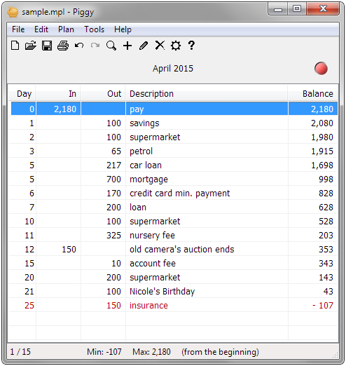 Piggy je jednoduchý, ale výkonný program pro správu svého měsíčního rozpočtu. Příjmy a výdaje jsou seřazeny podle jednotlivých dní, je možné přidat popisek i částku. Zaznamenané položky jsou zobrazeny číslem ve stavovém řádku v dolní části okna. Vše je efektivně přizpůsobitelné.