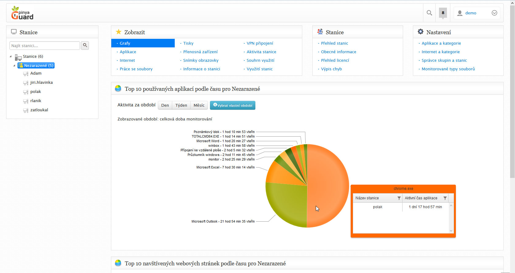 Software Pinya Guard přináší možnost monitoringu veškerých činností na počítači, a poskytuje tak úplný přehled o jeho využití. To se týká zejména aktivit na internetu, využití aplikací, e-mailu, VPN připojení nebo sledování připojených externích zařízení.
