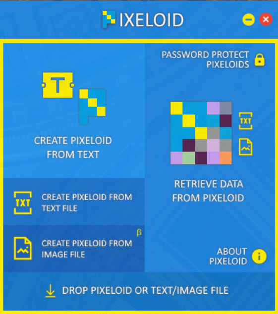 StáhnoutPixeloid se používá k zakódování textu nebo obrázků do matice, která je zašifrována a uložena v klasickém grafickém formátu (PNG, JPG nebo BMP). K zabezpečení dat se používá bloková šifra TripleDES založená na Data Encryption Standardu (DES), která danou kryptovací operaci provádí třikrát v řadě a zvyšuje tak zabezpečení zdrojových dat.