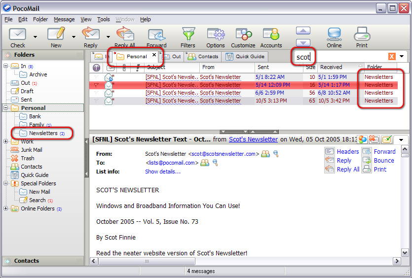 PocoMail - poštovní klient se zajímavým vzhledem konkurující MS Outlooku. Umožňuje práci s více účty, obsahuje dobrý filtr zpráv, možnost čtení zpráv přímo ze serveru atd.
