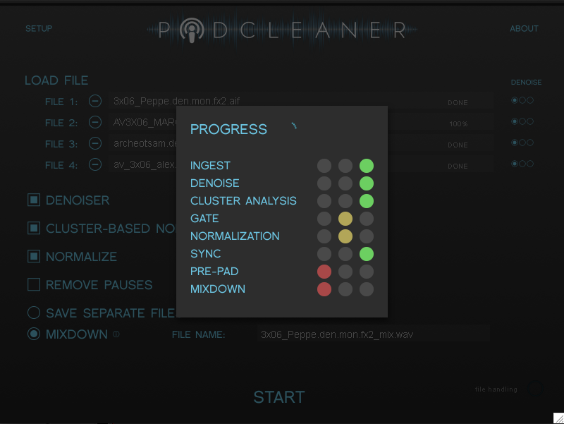 PodCleaner je program, určený ke zlepšení kvality podcastů a zvukových nahrávek. Je jednoduchý na používání, ale pod kapotou existují mocné technologie, které čistí zvukové stopy a automaticky je synchronizuje. PodCleaner má velmi jednoduché rozhraní: stačí nahrát soubory, které chcete zpracovat a stisknout tlačítko START, a to i s výchozím nastavením můžete dosáhnout optimálních výsledků.