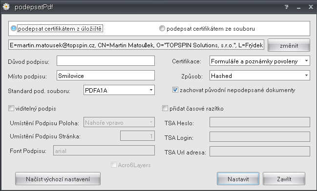 Základní nastavení vyžaduje pouze výběr uložiště certifikátu. Buď vyberete jeden z certifikátů v uložišti operačního systému, nebo zvolíte přímé umístění na pevném disku.