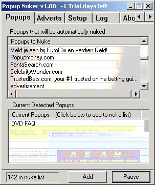 Popup Nuker je nástroj sloužící pro jednoduché blokování vyskakovacích oken a reklam. Program se integruje do prohlížeče Microsoft Internet Explorer a automaticky se spustí při otevření prohlížeče. Pokud nepoužíváte tento prohlížeč můžete použít Popup Nuker Configurator pro jakýkoliv prohlížeč.