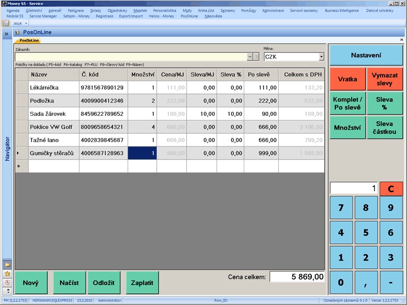 Podporuje zadávání položek pomocí klávesnicového scanneru načtením čárového kódu, katalogu, kódu či PLU. Navíc je umožněno přidávat položky i běžným výběrem z katalogu jako při tvorbě dokladu v Money.