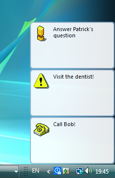 Nastavit lze libovolný počet opakování alarmů s vlastní zprávou, zvuk, barvu, fonty, ikony atd. Když se spustí alarm, vedle hodin plochy se na několik sekund zobrazí bublina s oznámením.