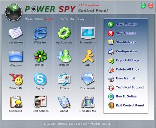Power Spy 2018 vám umožní sledovat, co vše uživatel dělal na počítači. Program běží skrýtý, tudíž je malé procento odhalení. Power Spy provádí monitoring zaměstnanců, dětí, apod., získává hesla ostatních uživatelů, chat záznamy, navštívené webové servery. Záznamy odešle do předem určené e-mailové adresy nebo na FTP server. Záznamy je možné zobrazit i na sledovaném počítači.