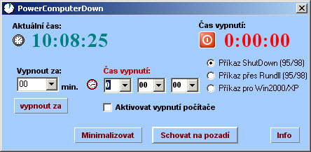 Program vypne váš počítač v určeném čase. Tento čas si můžete nadefinovat zvolením konkrétní hodiny, minuty a vteřiny nebo odpočtem za zvolených pár minut.