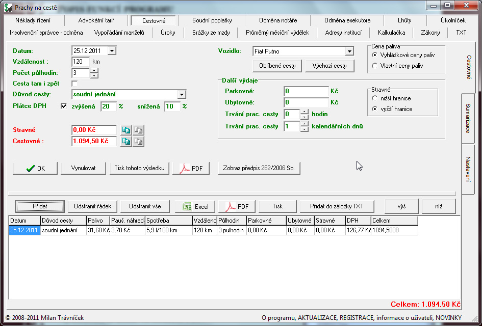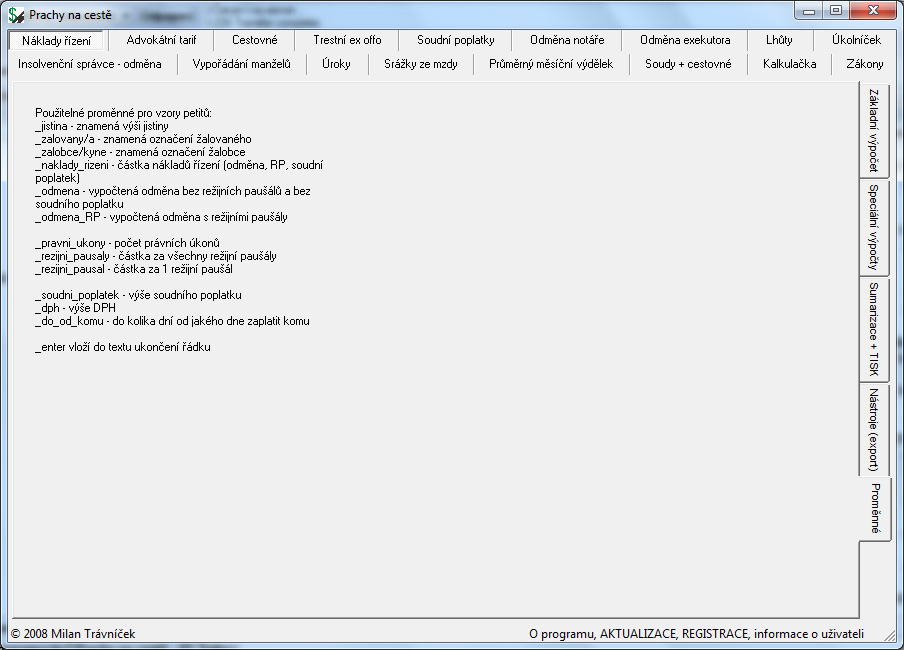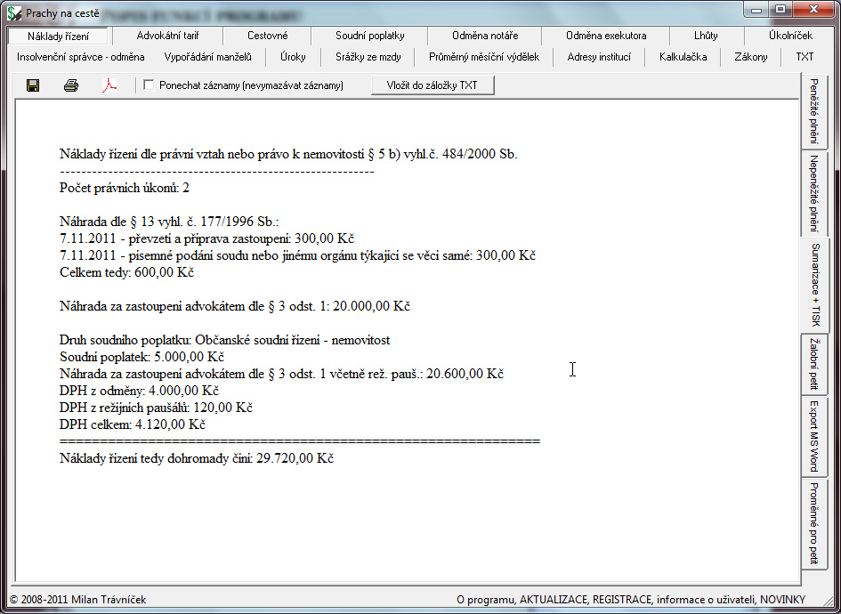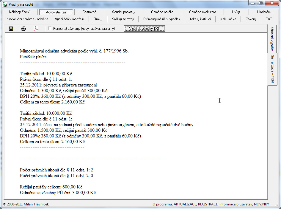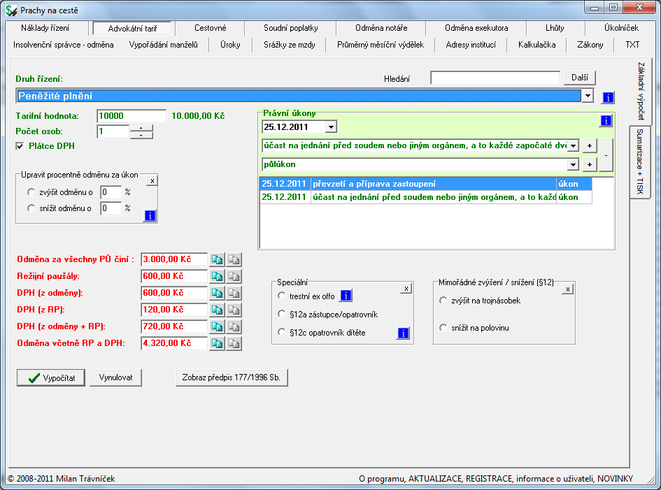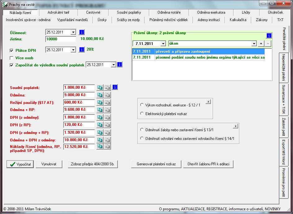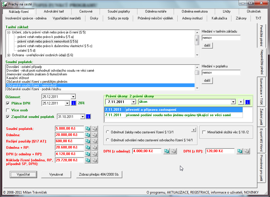 Tato právní kalkulačka počítá odměnu za právní služby, umí tedy spočítat odměnu advokáta podle vyhlášky č. 484/2000 Sb., advokátní tarif, soudní poplatky, atd.