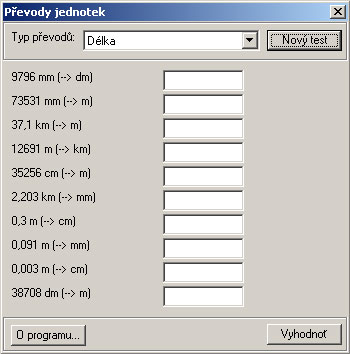 Program je určen pro učitele a studenty, díky kterému si můžete ověřit své znalosti v převádění jednotek. Vytváří testy na převody jednotek (Fyzika pro Zš).