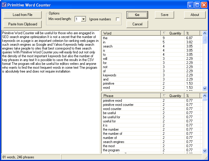 Primitive Word Counter je užitečný softvér pro všechny, kteří se zabývají SEO (optimalizace pro vyhledávače). Díky tomuto řešení snadno zjistíte počet nejdůležitějších klíčových slov, ale také počet klíčových frází v textu. Možnost uložení výsledku do CSV formátu. Program je užitečný také pro editory, spisovatele a každého, kdo chce najít nejčastější slova v určitém textu.