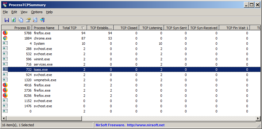 ProcessTCPSummary zobrazí všechny procesy (spuštěné programy), které komunikují se sítí prostřednictvím protokolu TCP a nebo naslouchají příchozímu připojení přes UDP. Podporuje protokoly IPv4 a také novější IPv6, zobrazí počet připojení k danému procesu, kolik bylo přeneseno dat nebo zda zrovna nějaké připojení běží. Výsledky je možné uložit do .CSV, program se doporučuje spustit jako správce.