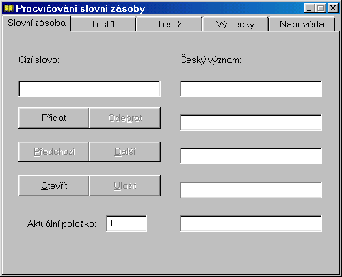 Program je vhodný, jak už z názvu vyplývá, na procvičování slovní zásoby libovolného cizího jazyka. Kromě samotného testování znalosti slovíček program umožňuje i editaci slovní zásoby. Nová slovíčka se pak ukládají do souborů s příponou *.slv. Slovíčka lze procvičovat dvěma způsoby, buď přímým zápisem správného významu, nebo přiřazením významu s deseti možností. Aplikace navíc obsahuje dva soubory se slovní zásobou anglických slovíček. Jeden z nich obsahuje sto anglických názvů zvířat a druhý pak stejný počet slovíček určených pro pokročilé.