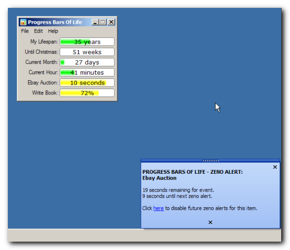 Může to být docela snadné zapomenout na důležité události, jako jsou schůzky nebo něčí narozeniny, atd. Progress Bars of Life vám pomůže. Zobrazí vám všechny důležité události a přehraje k tomu vámi nastavené zvuky. Standardní Průvodce nastavením vás provede řadou základních konfigurací, stejně jako výběrem cílové složky nebo tvorbou zástupců.
