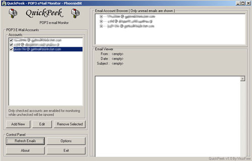 QuickPeek je výkonný a rychlý pop3 email monitor. Tento program monitoruje váš pop3 účet a informuje o příchozí poště. Umožňuje také stahování nové pošty, aby jste věděli obsah emailu bez nutnosti otevírat jiné, systémově náročnější aplikace. Program dokáže monitorovat více účtů najednou.