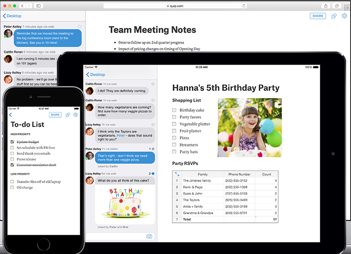 Quip je balíček kancelářských utilit a aplikací. S tímto programem může každý editovat stejnou verzi dokumentu ve stejnou dobu z libovolného zařízení. Součástí je i editor tabulek podporující více než 400 funkcí. Program obsahuje mnoho skvělých funkcí pro ulehčení vaší práce, mimo jiné i chatovací nástroj. Dokumenty lze importovat přes Dropbox, Evernote, Google Drive, Box a Google Docs. Export dokumentů je pak možný do PDF, Microsoft Office, Microsoft Office nebo s pomocí cloudových služeb (Gmail, Yahoo, Hotmail, Microsoft Outlook, Google, iCloud).