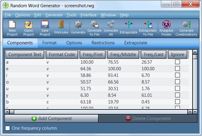 Random Word Generator je praktický nástroj, který vytváří seznamy náhodných slov. Používá engine pro generování vysoce přizpůsobitelných slov, za pomocí statistik z více než 300 000 anglických slov. Konfiguraci enginu lze uložit do "Project" souboru. Dokáže vytvářet náhodná slova přímo z konkrétního slova.