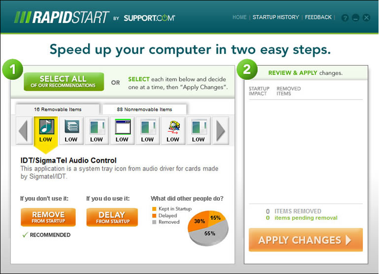 RapidStart obsahuje 3 složky: Doporučení, Aplikovat změny a Historie StartUp (spuštění) Windows. Tyto možnosti Vám pomohou nastavit a zrychlit spuštění systému.
