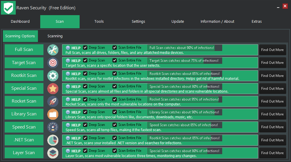 Raven Security je spolehlivý nástroj, který je schopen detekovat hrozby, škodlivé soubory a viry v počítači. Aplikace může provádět lokalizované, rychlé, nebo hloubkové prověřování za účelem zjištění škodlivého kódu nebo jiného nebezpečí, které souborům hrozí. Navíc, po zjištění Vám umožní přesunout soubory do karantény nebo je rovnou smazat.