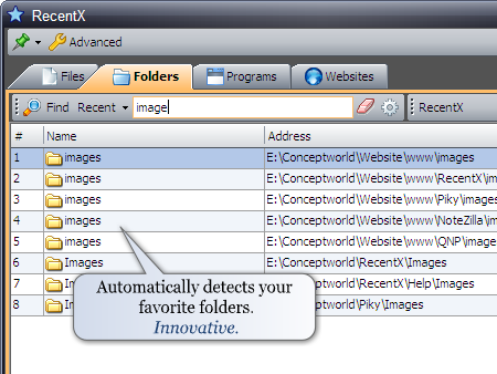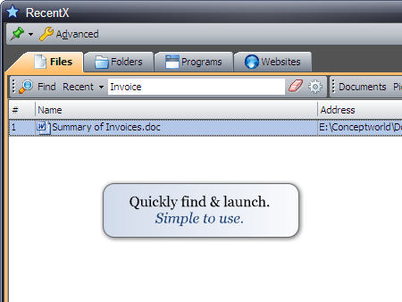 RecentX je nástroj pro snadné a rychlé spouštění jakýchkoliv dokumentů, složek, programů a záložek, v pouhých 3 krocích. Nestrácejte mnoho času prohledáváním souborů či aplikaci nacházejících se někde ve vašem počítači! Stačí napsat název a je to!