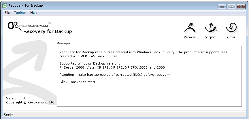 Recovery for Backup opraví soubory vytvořené s Windows Backup utilitou. Produkt také podporuje soubory vytvořené pomocí VERITAS Backup Exec.