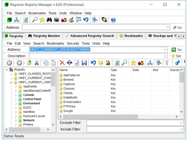 Registrar Registry Manager je software určený pro práci s registry. Nabízí řešení pro zálohování a obnovení registrů, rychlé vyhledávání na pozadí, zvýrazňování klíčů, vytváření záložek, defragmentaci registrů a nástroje pro snadnou navigaci. Velkou výhodou je vícenásobné vrácení se zpět v úpravách či přidávání popisků k jednotlivým klíčům. Poskytuje bezpečnostní editory, které vám umožní nastavit přístupová oprávnění na vašich klíčů registru.