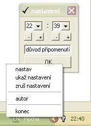 Program běží rezidentně (na pozadí, zobrazení v systémové liště vedle hodin), po kliknutí pravým tlačítkem myši (vyskočí kontextové menu) možnost nastavit čas upozornění, případně text upozornění. V nastavenou dobu se sám připomene informační bublinou.