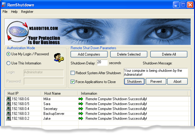 RemShutdown umožňuje vypnout nebo restartovat vzdálené počítače v síti. Možnost zadat zpoždění a dobu, běhém které se zobrazí na vzdáleném počítači čas za jak dlouho bude proveden restart nebo vypnutí pc. Pokud se rozhodnete, že chcete pokračovat v práci na pc, můžete nastavený restart či vypnutí zrušit!