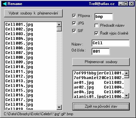 Program slouží k přejmenovávání většího počtu souborů, kdy se potřebujeme zbavit původních názvů, omezit je na číselné názvy nebo před existující názvy předřadit náš název celé skupiny souborů. Je velmi vhodný například pro stahování obrázků z internetu, které nám přečísluje a uloží přesně tak, abychom si vybavili o co jde již při pohledu na název souboru. U obrázků umožňuje náhled, s ostatními soubory pracuje běžným způsobem. Velice rychlé a intuitivní ovládání. Stejně tak jako u ostatních programů přiložen podrobný návod.