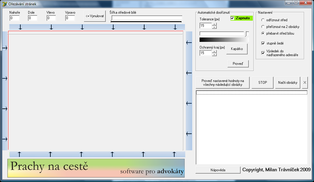 Program Řezání obrázků slouží k poloautomatickému oříznutí většího množství obrázků. Uživatel si může sám nastavit rozměry oříznutí ze všech 4 stran a navolit možnost umazání "černého středu" listu u knižních vazeb. Druhou možností je "rozstřižení" strany na dva samostatné obrázky.