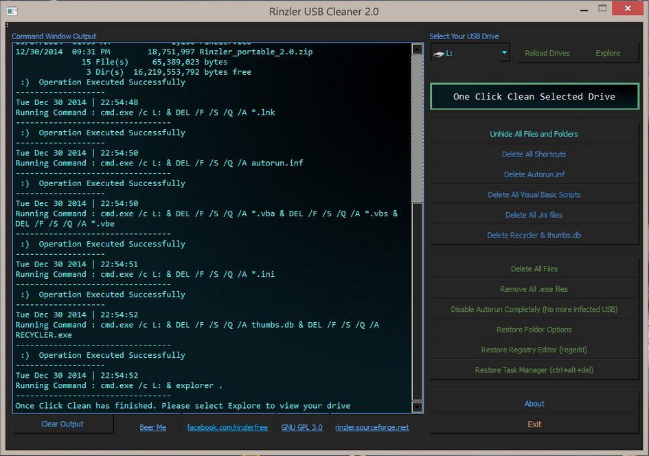 Rinzler USB Cleaner je malý nástroj, který odstraňuje škodlivé skripty vytvořené viry nebo malware, slouží k zobrazení složky a souborů, odstraní všechny zástupce z vybrané jednotky. Také úplně zakáže autorun a poskytuje možnost změnit v registru, možnosti složky a správce úloh.