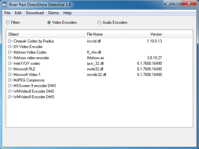 River Past DirectShow Detective Vám ukáže kompletní seznam nainstalovaných DirectShow filtrů, video a audio kompresi, kompresi jejich verzí a instalovaných souborů.