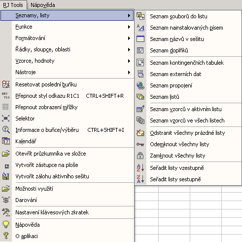 StáhnoutRJ Tools je sada nástrojů sloužících jako doplněk pro Microsoft Excel. Skládá se z těchto nástrojů a funkcí: