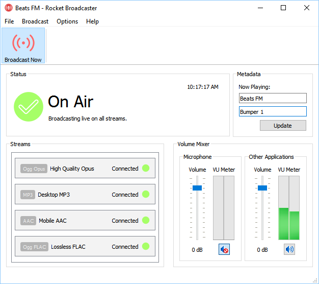 Rocket Broadcaster je aplikace, která zaznamenává audia z různých zdrojů a vysílání prostřednictvím jedné ze streamovacích internetových služeb jako SHOUTcast, Icecast, Radio.co nebo třeba radionomy. Zvuk můžete tak zachytit pomocí mikrofonu nebo aplikací třetích stran, případně jejich kombinací. Samozřejmostí je použití existujících souborů (MP3s, AACs, Ogg Vorbis, Ogg Opus, Ogg Flac).