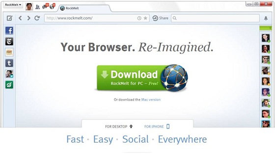 Hlavní výhodou prohlížeče RockMelt je propojení s nejpopulárnějšími sociálními sítěmi Facebook nebo Twitter a rychlý přístup k nim pomocí přímých tlačítek. Můžete být tak se svými přáteli kdykoliv v kontaktu.