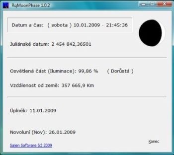 Aplikace zobrazující aktuální fázi měsíce, tendenci (dorůstá) a (odrůstá),vzdálenost od země, informace k úplňku a novu. Datum a čas, juliálské datum. Program je volně šiřitelný. Kompilace v jazyce Rapid-Q.