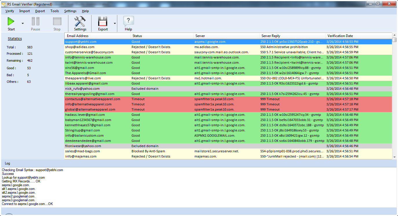 RS Email Verifier je jedinečný a výkonný program, který ověřuje každou e-mailovou adresu z mailing listu a určuje, zda jsou e-maily platné, nebo ne. RS Email Verifier je snadno ovladatelný a spolehlivý software navržen tak, aby hromadně určil a odstranil nadbytečné a mrtvé e-mailové adresy.