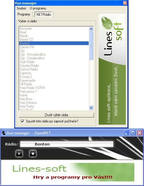 Run manager je manager, který slouží pro spuštění oblíbených programů a NetRádia po naběhnutí Vašeho operačního systému.