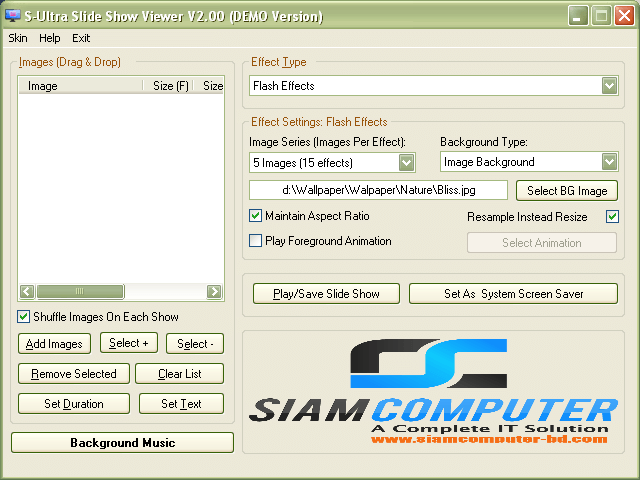S-Ultra Slide Show Viewer je pomocný nástroj pro přehrávání fotografických prezentací. Své prezentace můžete použít jako spořič obrazovky. Nástroj umožňuje zvolení zdrojových obrázků, nastavení délky zobrazení snímků individuálně nebo pro všechny fotky současně, nastavení hudby přehrávané na pozadí (MP3, WMA nebo WAV) či aplikování mnoha efektů (standardní, Flash nebo 3D efekty).