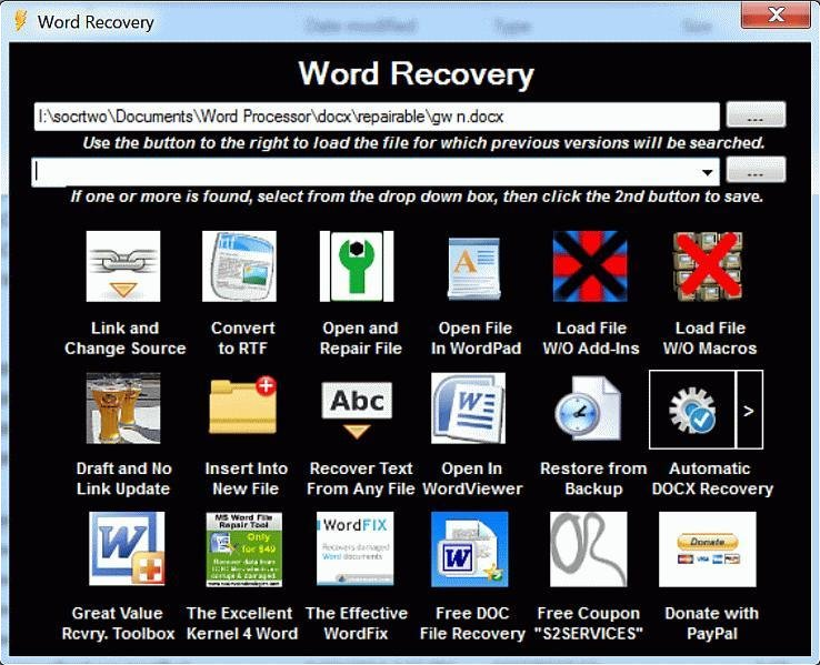 S2 Recovery Tools for Microsoft Word je nástroj, který umí opravit poškozené dokumenty MS Word pomocí pěti různých metod. Podporovány jsou dokumenty typu DOC i DOCX. Zajímavostí je předinstalované vyhledávací prostředí, které má na starosti nalezení dočasných, odstraněných nebo ztracených verzí poškozeného dokumentu.