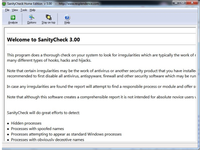 SanityCheck je moderní software pro Windows, určený k detekci rootkitů a malware v počítači. Software po provedení kontroly nabízí srozumitelnou zprávu, která dává podrobné vysvětlení případných nesrovnalostí a nabízí návrhy na to, jak řešit, nebo dále zkoumat jakékoli situace.