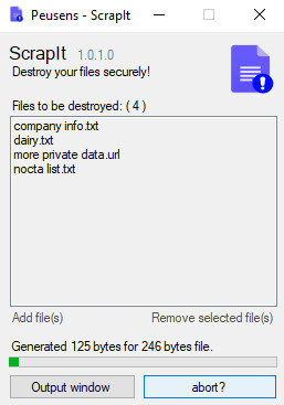 ScrapIt je nástroj, který zajišťuje bezpečné odstranění souborů z disku. Zajišťuje to tím, že přepíše skutečný obsah souboru řadou náhodných dat. To znemožní obnovení souboru, i když jej používáte software pro obnovu dat.