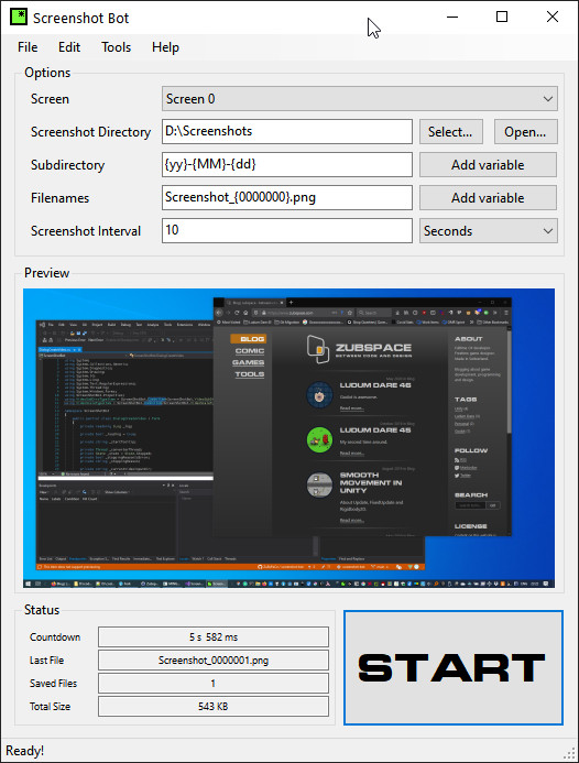 Screenshot Bot je program, který vám umožní automaticky pořizovat snímky obrazovky pro časosběr. Po skončení relace můžete snímky spojit do videa s volitelnou snímkovací frekvencí. Program podporuje více monitorů a umožňuje vám nastavit interval vytváření snímků.
